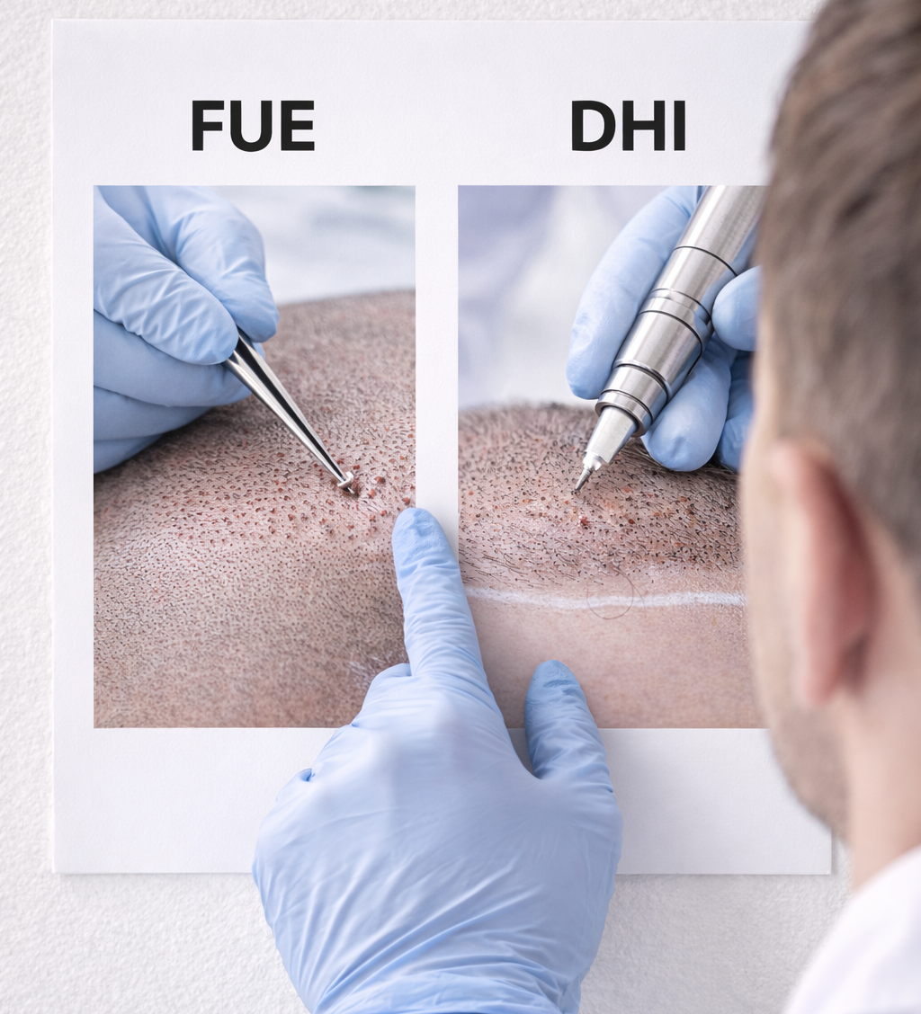 FUE — классический бесшовный способ извлечения фолликулов из донорской зоны и их перенос в зону истончения. DHI — это подметод внутри FUE: имплантация выполняется имплантером, что помогает точнее задать угол и направление роста. Мы применяем оба подхода и комбинируем их по показаниям.